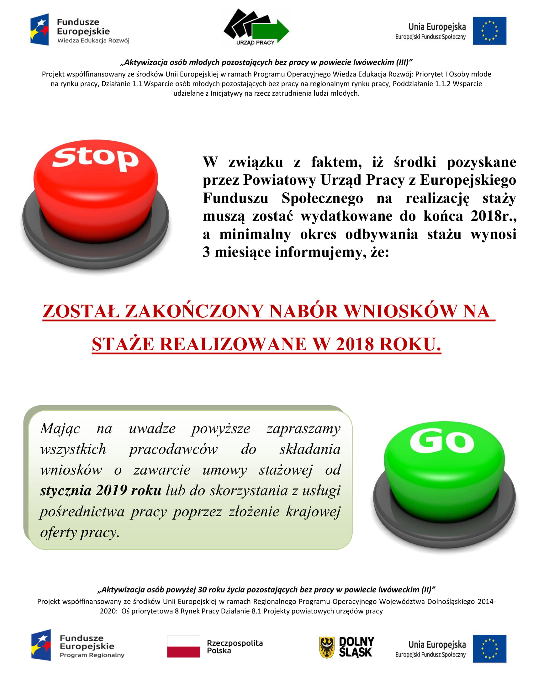 W związku z faktem, iż środki pozyskane przez Powiatowy Urząd Pracy z Europejskiego Funduszu Społecznego na realizację staży muszą zostać wydatkowane do końca 2018r., a minimalny okres odbywania stażu wynosi 3 miesiące informujemy, że
