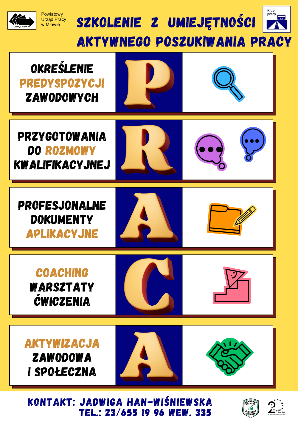 Jednym z celów naszego szkolenia jest wzmocnienie wiary każdego z uczestników w samego siebie, podniesienie poziomu motywacji oraz pobudzenie aktywności do zmiany swojej sytuacji. Udział w szkoleniu zwiększa szansę na podjęcie zatrudnienia, uczy umiejętności w poszukiwaniu pracy, podnosi wiarę we własne możliwości. Aktywny udział pozwala ocenić uczestnikowi możliwości i szanse na rynku pracy, przygotowuje do intensywnego i efektywnego poszukiwania pracy oraz podwyższa poziom motywacji oraz zmiany swojej sytuacji.