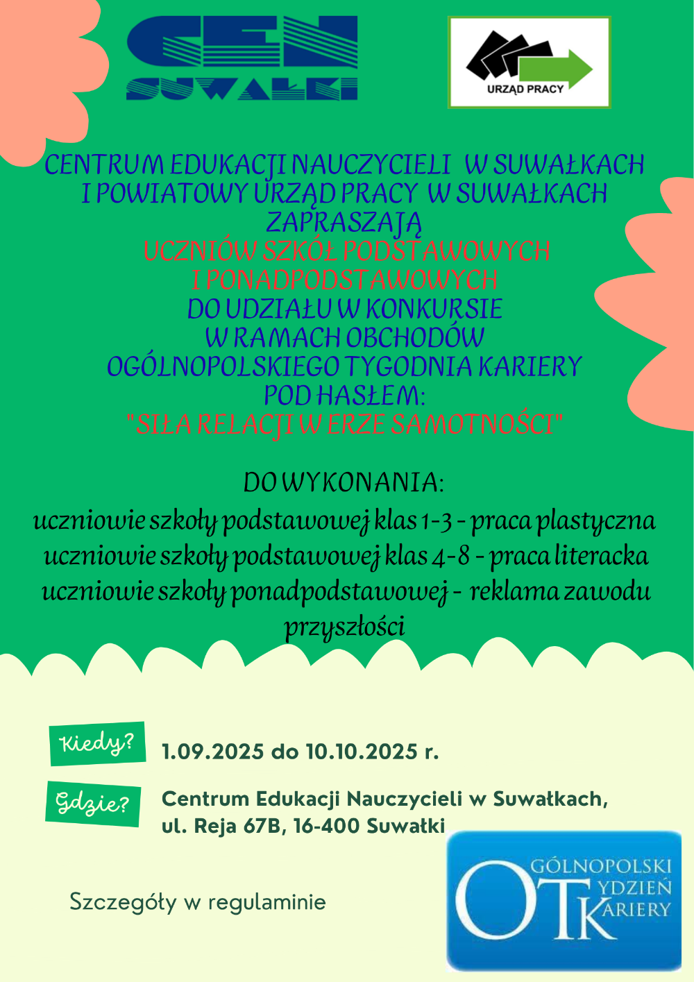 Konkurs „Siła relacji w erze samotności” organizowany jest przez Centrum Edukacji Nauczycieli w Suwałkach i Powiatowy Urząd Pracy w Suwałkach w ramach XVII Ogólnopolskiego Tygodnia Kariery.