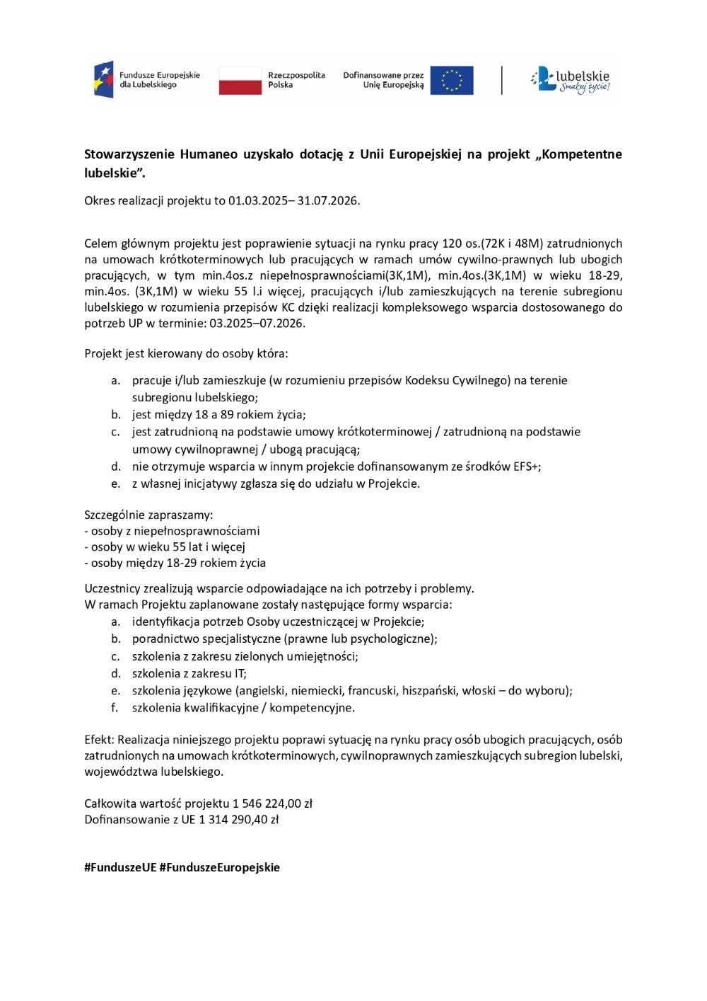 Szczegóły znajdą Państwo w załączonej fiszce informacyjnej oraz na naszej stronie: https://www.humaneo.pl/kompetentne-lubelskie/